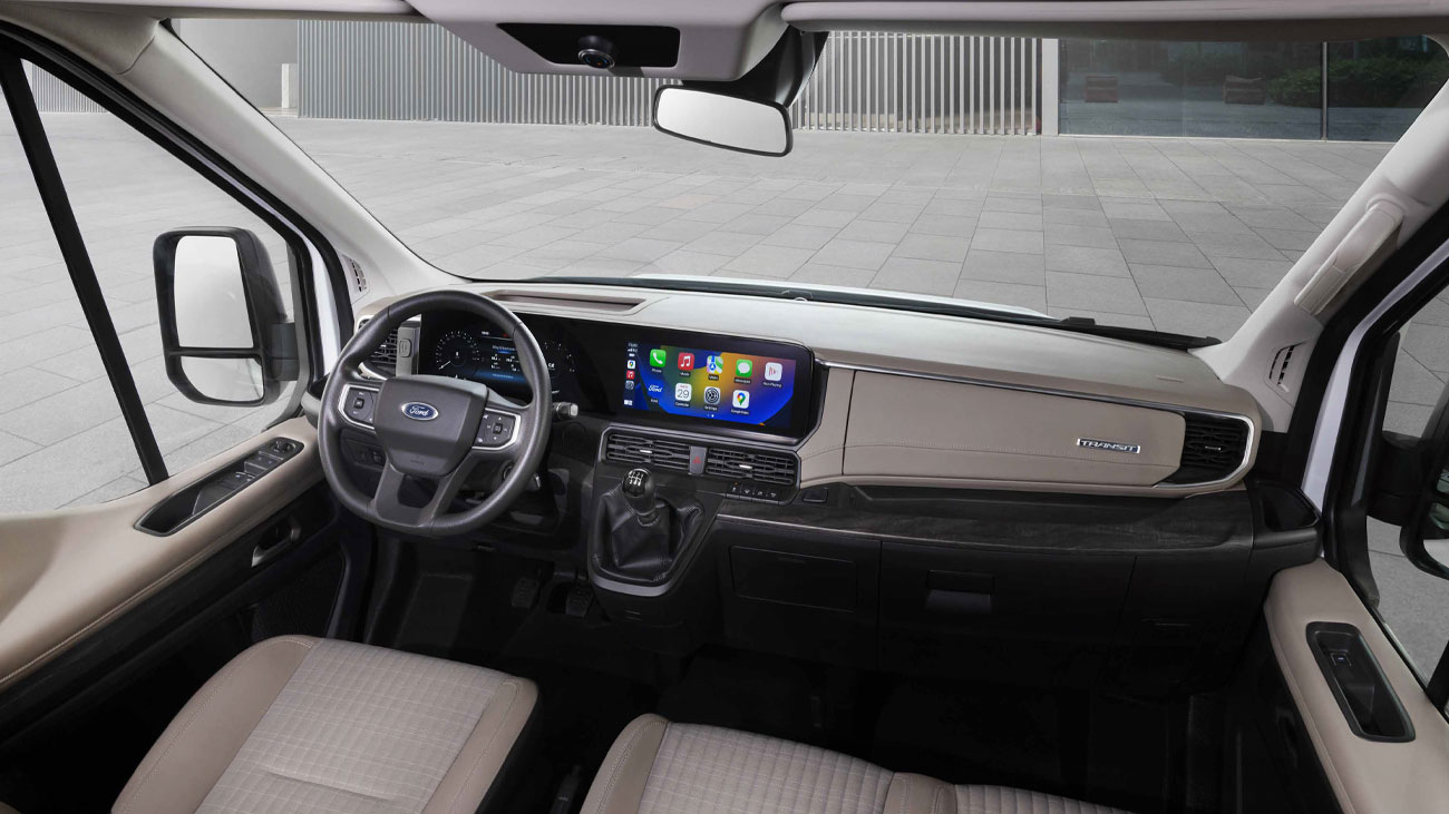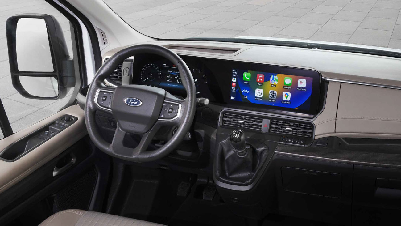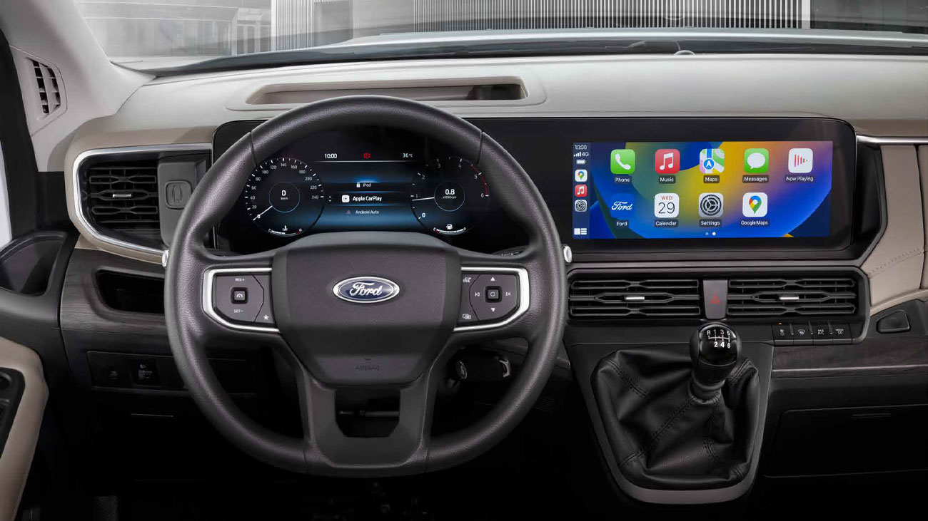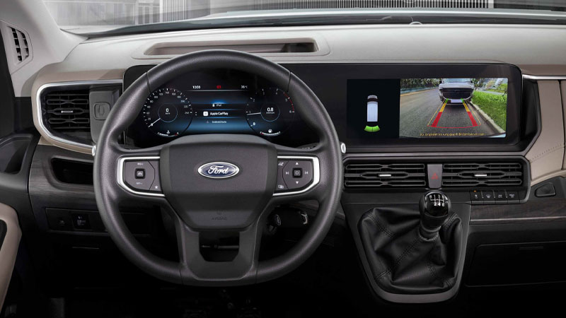 Lần đầu tiên, Ford Transit được trang bị màn hình đôi cỡ lớn. Màn hình trung tâm có tính năng cảm ứng hỗ trợ kết nối Apple CarPlay® và Android Auto” không dây, hỗ trợ bản đồ dẫn đường, điện thoại rảnh tay, giải trí cùng nhiều tính năng khác.